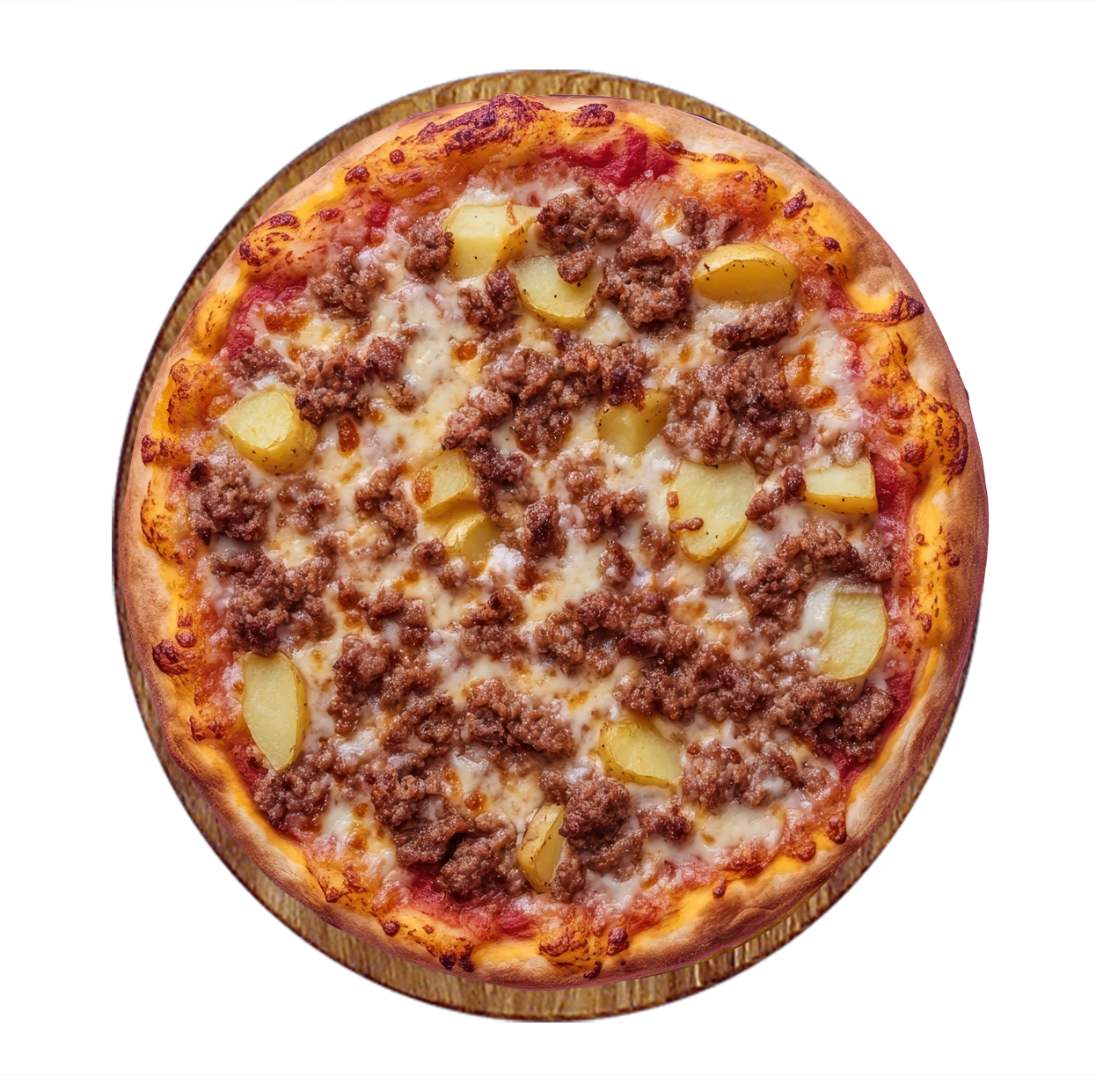 Crème fraîche, mozzarella, viande hachée, pommes de terre, sauce andalouse.