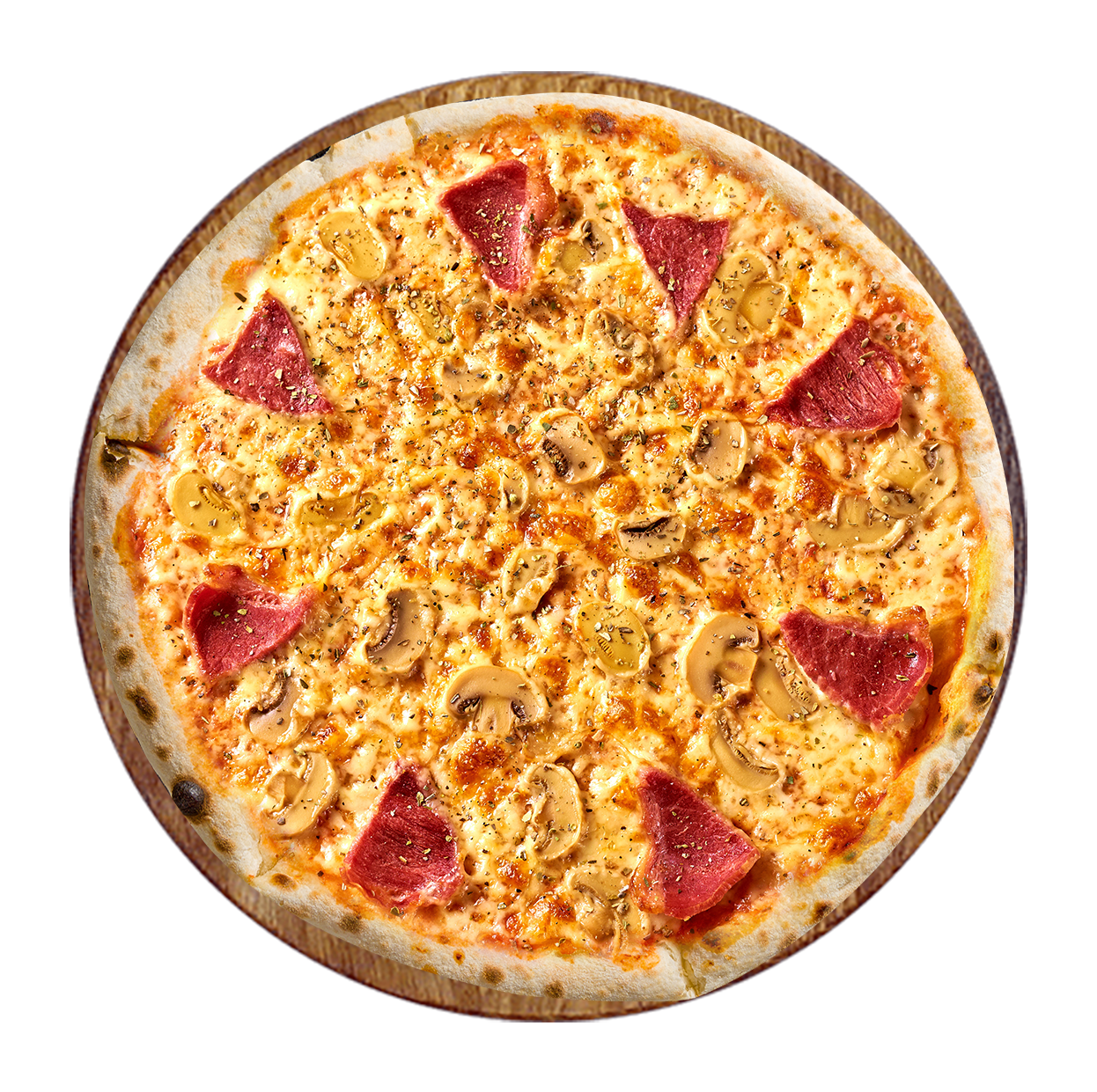 Sauce tomate, mozzarella, oignons, jambon, champignons, poivrons.