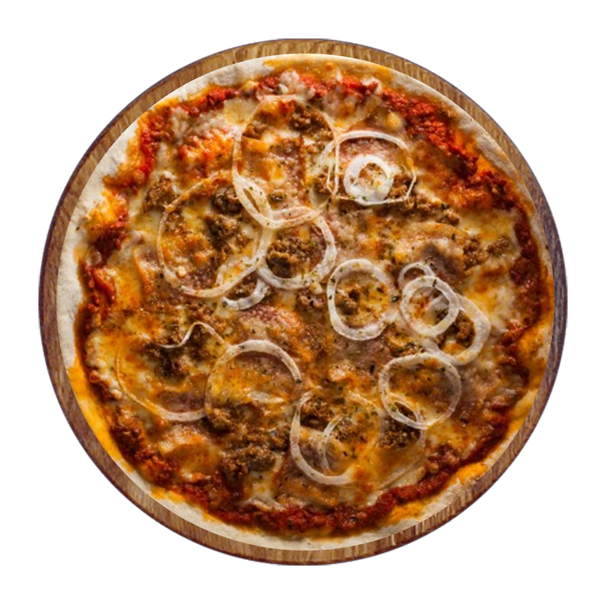 Sauce tomate, mozzarella, viande hachée, jambon, oignons.