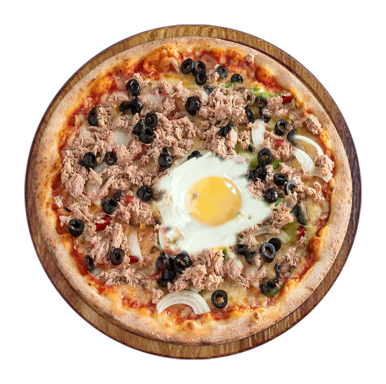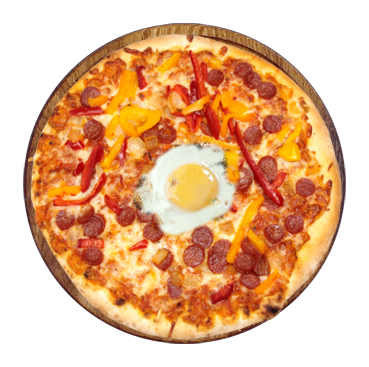 Sauce tomate, mozzarella, merguez, poivrons, olives, oeuf.