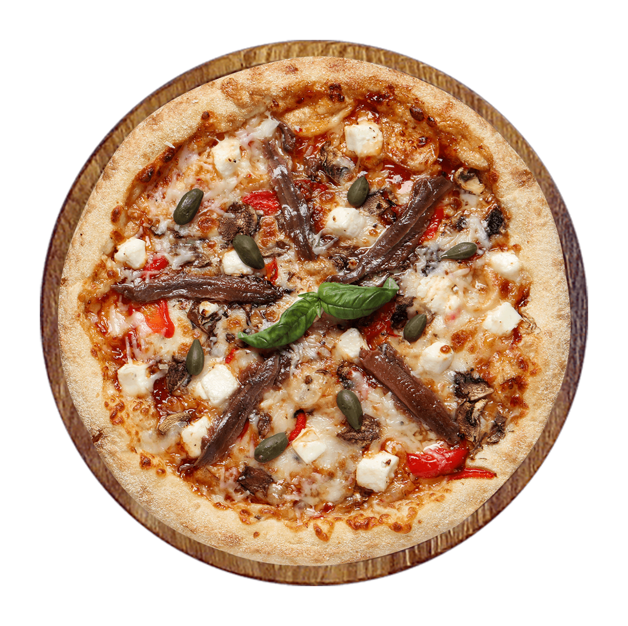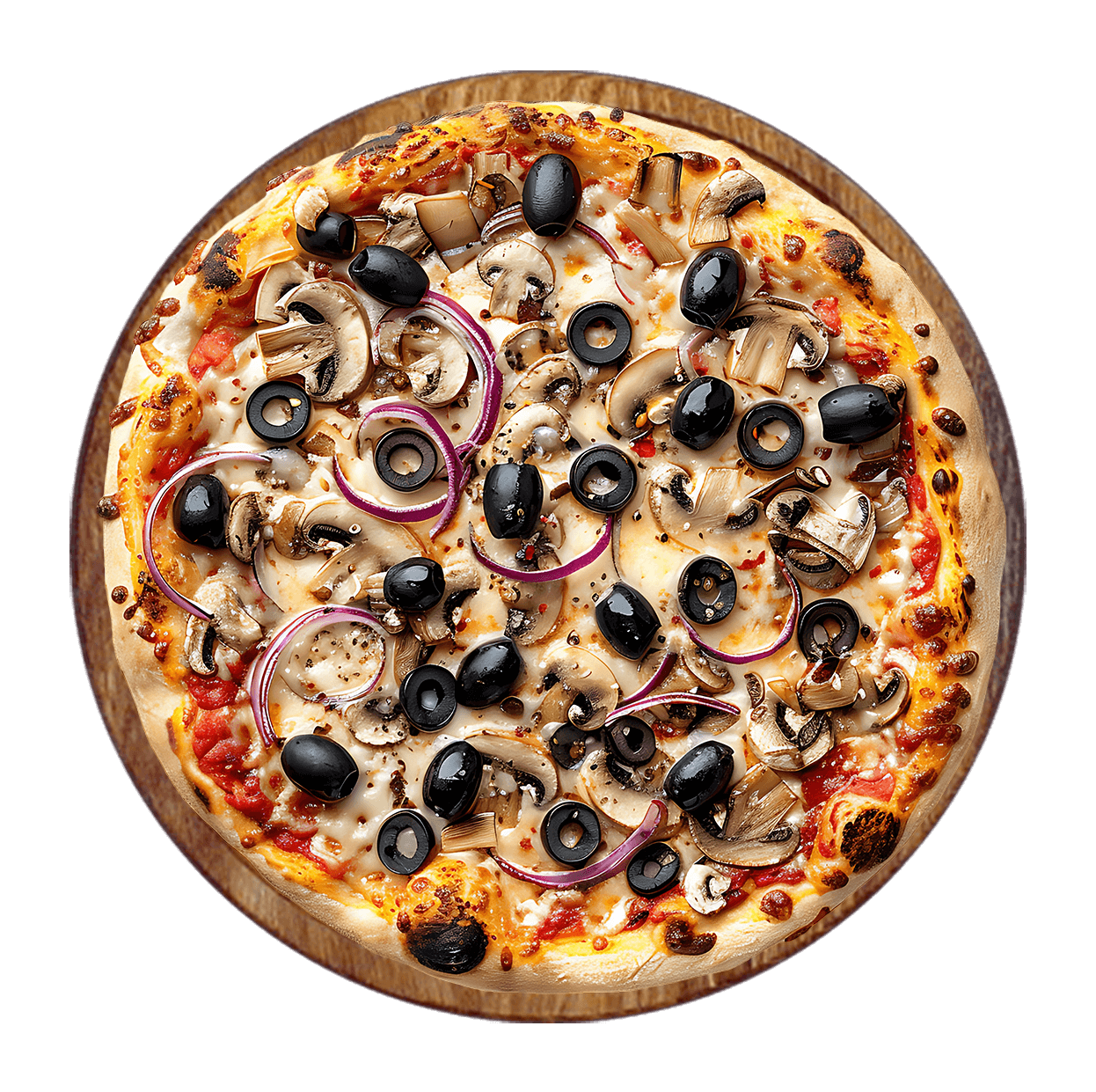 Sauce tomate, mozzarella, champignons, olives, poivrons, oignons, tomates.