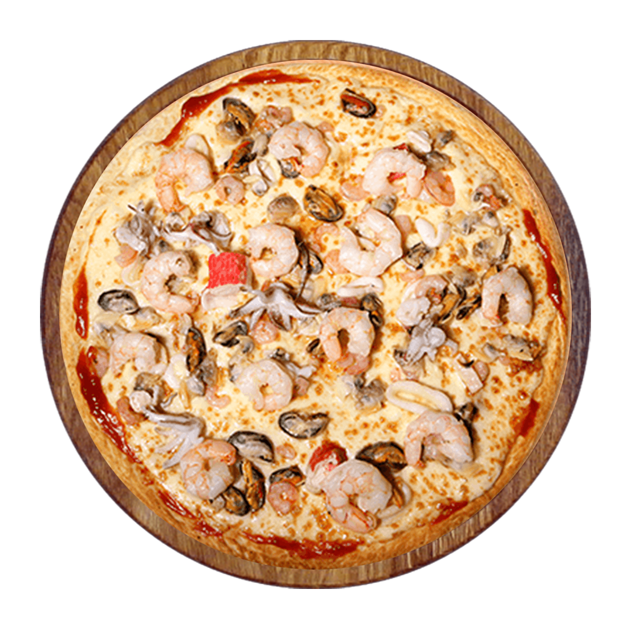 Sauce tomate, mozzarella, cocktail de fruits de mer, ail, persil.