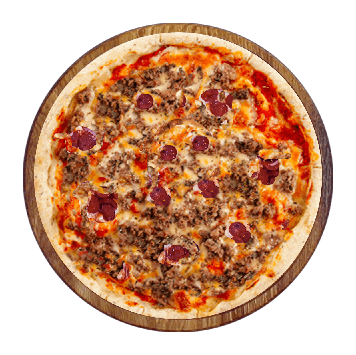 Sauce tomate, mozzarella, viande hachée, chorizo, cheddar.