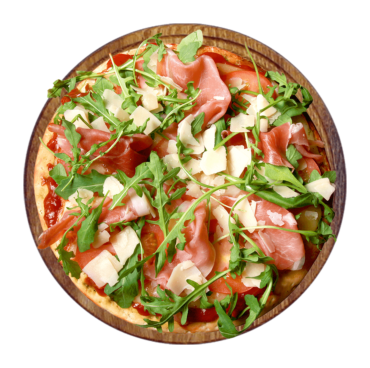 Sauce tomate, mozzarella, jambon, parmesan, feuilles de roquettes.