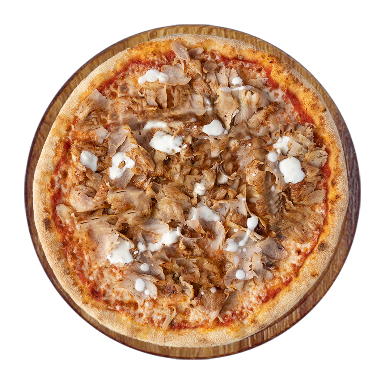 Sauce tomate, mozzarella, poulet, pommes de terre, oignons.