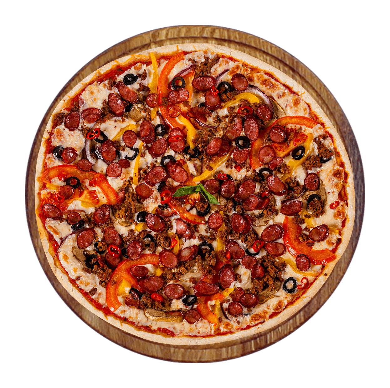 Sauce tomate, mozzarella, merguez, viande hachée, poivrons, olives.
