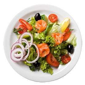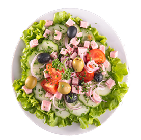 Salade, tomates, poulet, pommes de terre, oeuf, olives.