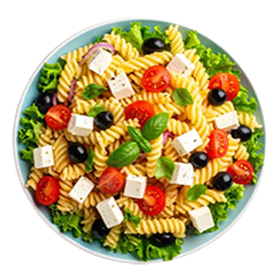 Salade, tomates, pâtes, poivrons, oignons, olives, mozzarella.