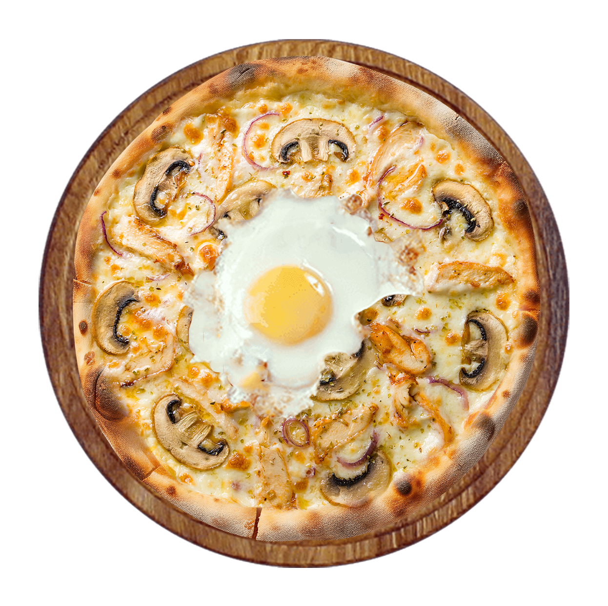 Crème fraîche, mozzarella, poulet, champignons, oeuf, olives.